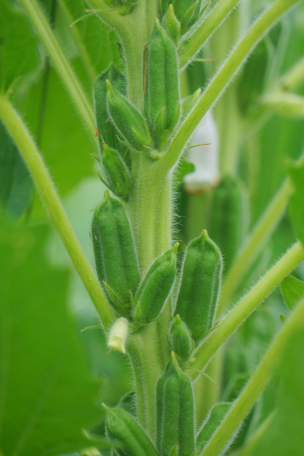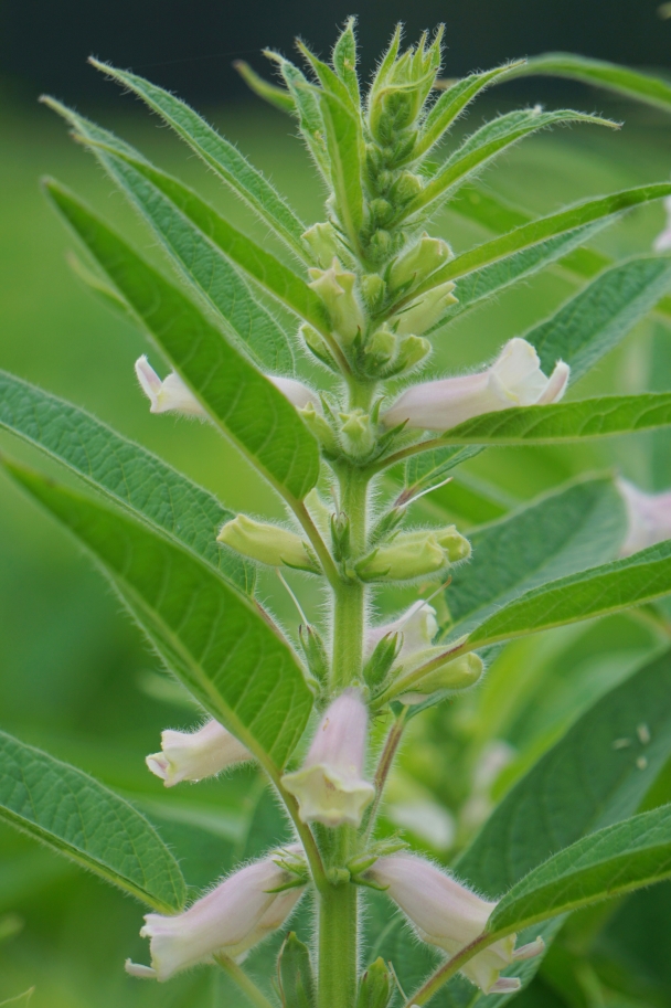 Sesame is a drought-tolerant, heat-loving plant. As growers, it fills our need for a summer crop to follow the cool season grains, and is a pollinator plant to boot. The lovely, white zoophilic flowers attract bees especially. Upon pollination, four rows of neatly and vertically stacked sesame seeds develop.